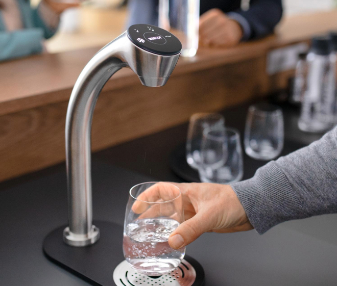 Επιλογή έως και πέντε τύπων νερού: παγωμένο ή μη, φυσικό, ελαφρώς ανθρακούχο και ανθρακούχο και ζεστό νερό κατά παραγγελία.